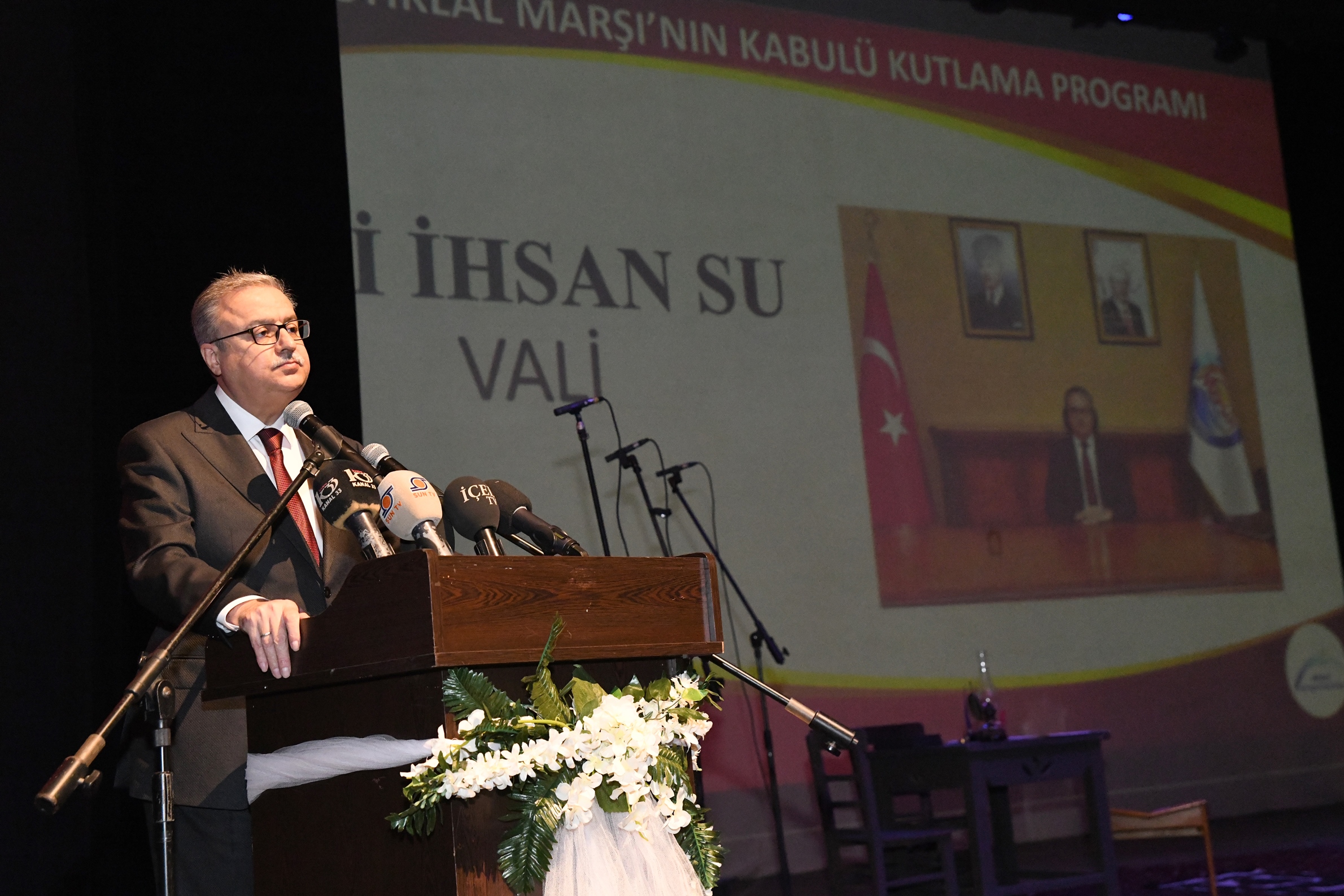 Saygı duruşu ve İstiklâl Marşı’nın ardından “10 Kıta Tek Ruh” sinevizyon gösteriminin yapıldığı etkinlikte konuşan Vali Ali İhsan Su, Kurtuluş Savaşı’nın zor şartlarda, imkânsızlıklar içerisinde verilerek kazanıldığını belirterek; “O ruhun en önemli ateşleyicilerinden biri de İstiklal Marşımızdı. Bizi o dönemde, o zor şartlarda birleştiren, bütünleştiren, azmimizi, kararlılığımızı artıran, vatan, millet, bayrak ülküsü ile bizi bir bütün haline getiren İstiklal Marşımızdır.” dedi.